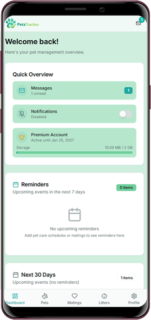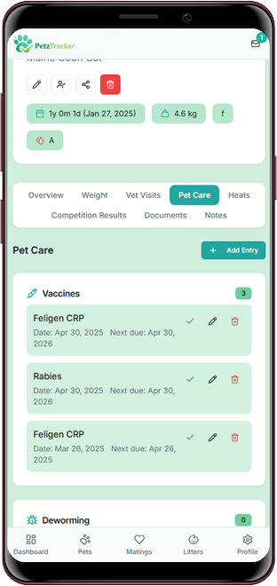 Stop losing pet records in chats, papers, and spreadsheets. PetzTracker keeps everything in one place: care, documents, breeding timelines, and reminders.
